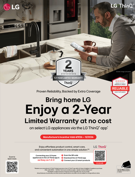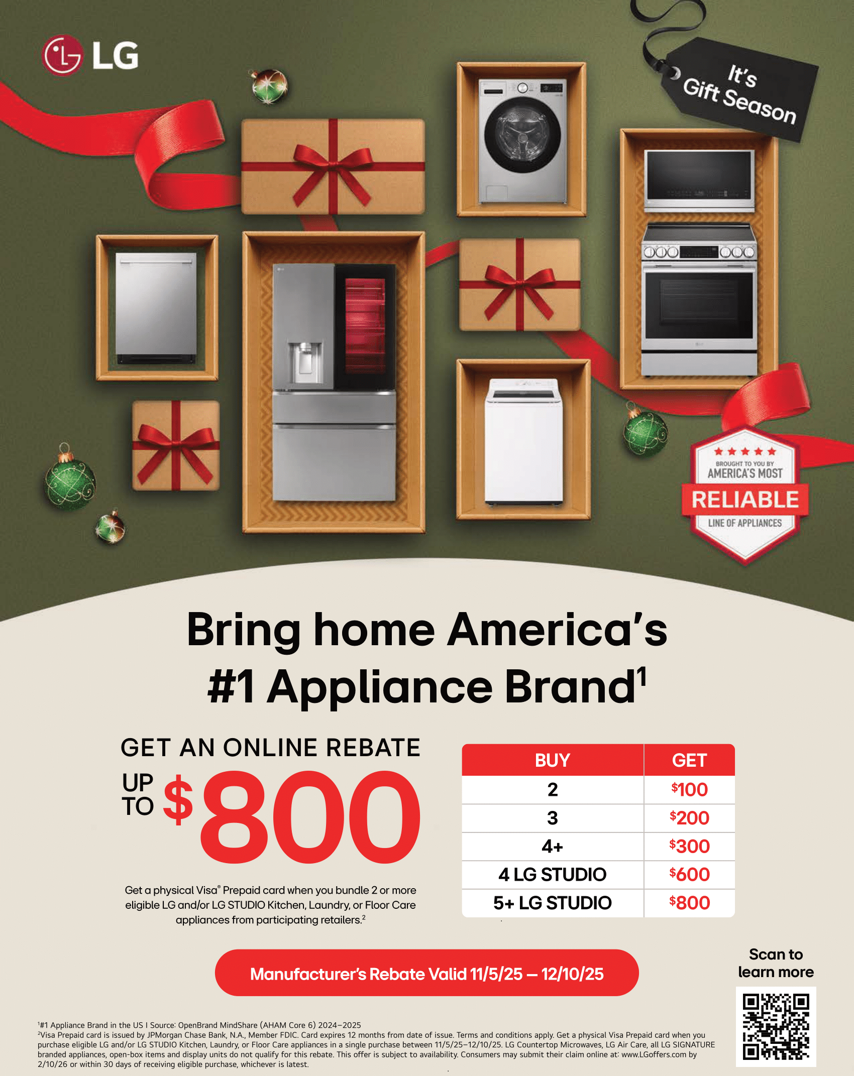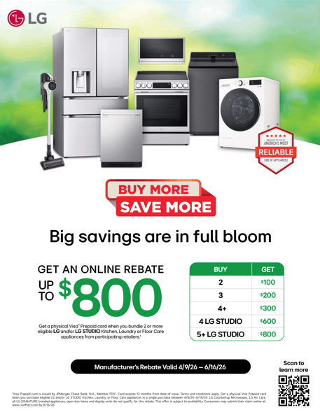 Get a physical Visa Prepaid card in the amount of $200–$2,000 when you purchase two (2), three (3), or four (4) or more eligible LG and/or LG STUDIO Kitchen, or Laundry appliances in a single purchase between September 11, 2025 and October 1, 2025 (the “Program Period”). Bundle must include two (2) eligible appliances to qualify for a $200, three (3) eligible appliances to qualify for a $600, four (4) or more eligible appliances to qualify for a $1,000 rebate. LG STUDIO bundle must include four (4) eligible LG STUDIO appliances to qualify for a $1,600, five (5) or more eligible LG STUDIO appliances to qualify for a $2,000 rebate. Consumers may receive a maximum of $2,000 by purchasing five (5) or more LG STUDIO appliances. This offer is subject to availability. The maximum number of appliances of the same category allowed to qualify for this rebate is two (2) except Over-The-Range Microwave maximum is one (1). Consumers may submit their claim to LG Electronics USA online at: www.LGoffers.com.